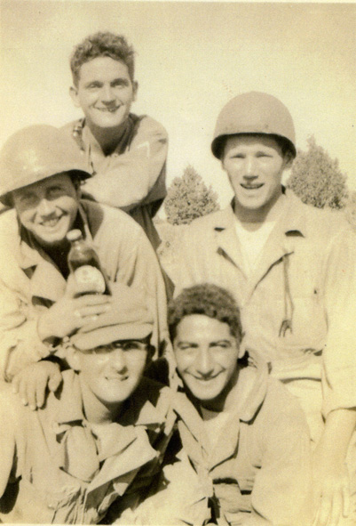 The 299th during maneuvers at Camp White, Oregon. (L to R/Bottom) - TS John Simmons, PVT Frank (Fuzzy)Fazalaro (L to R/Middle) CPL Don Georger (KIA D-Day), PVT Bill Banks (KIA Phillapines) (Top) PVT Donald Sweetapple Photo Provided from: Mike Accordino - PFC "A" Company |