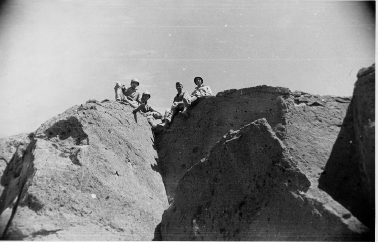 The 299th in the Oregon Desert July-1942. (Left to Right) --- PFC Eddie Olynjek, CPL Jay Armstrong, LT. Welsh, PVT Dickhart, PVT Lowenstein Photo Provided from: James Armstrong (CPL Armstrong's son) |