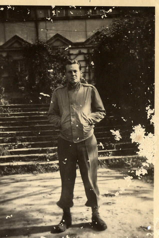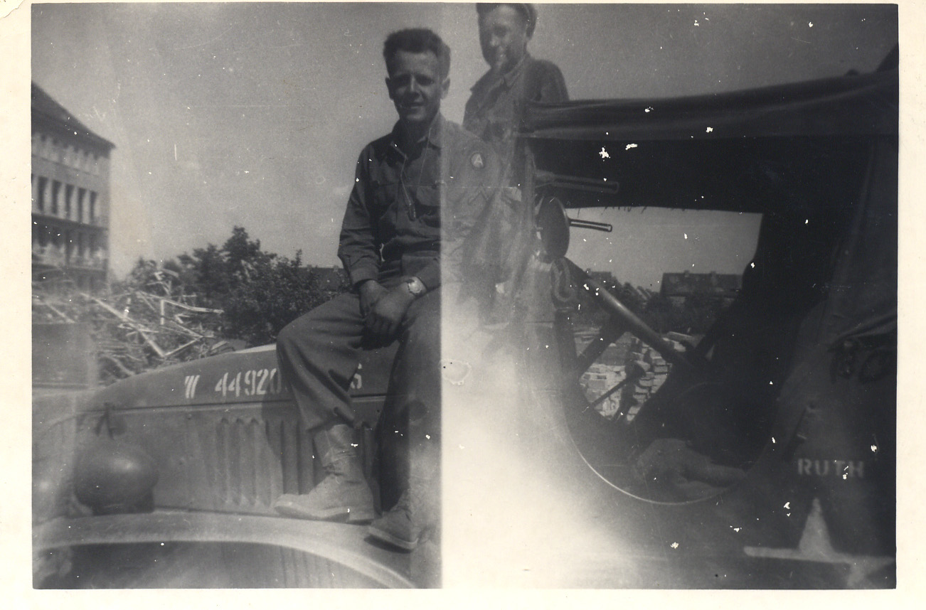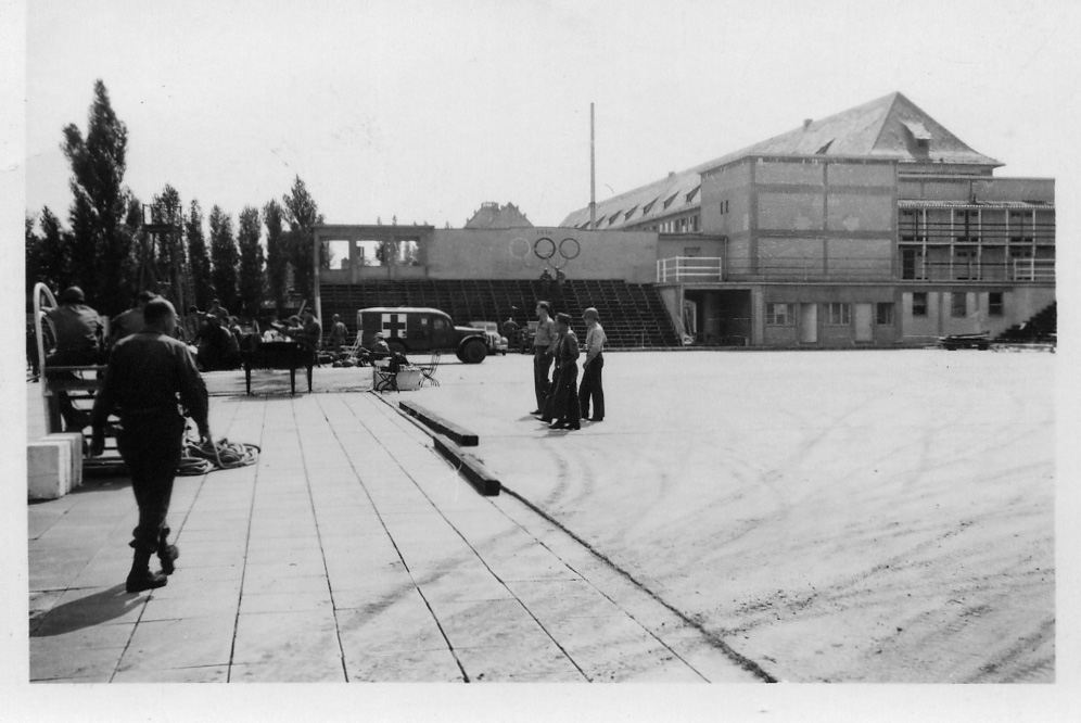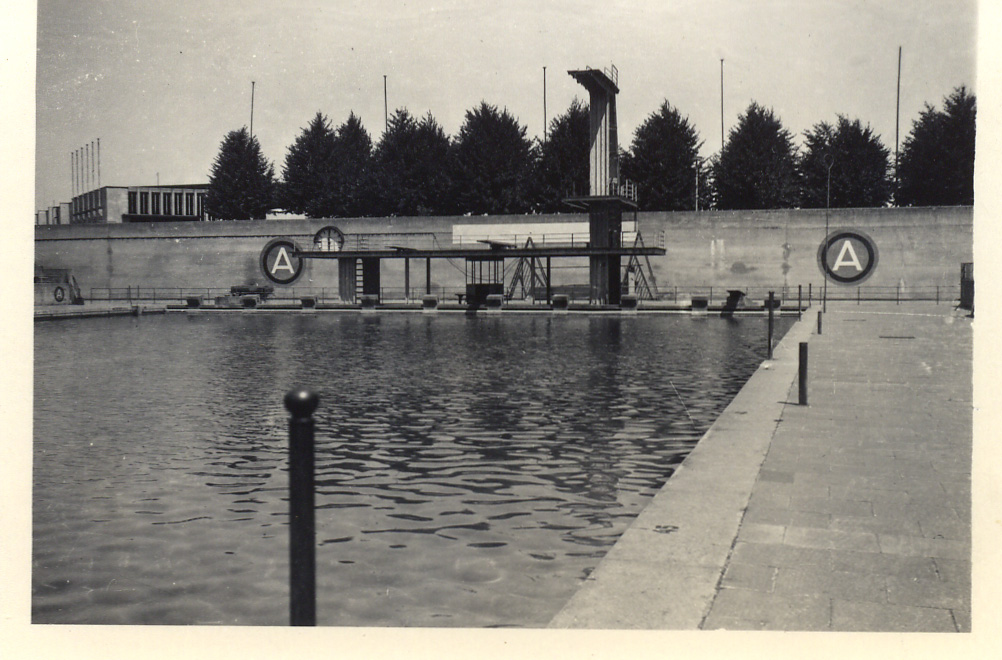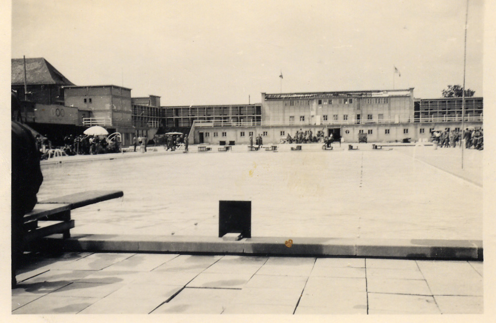 Army using the Swimming Pool at Neuremberg. This pool was used for the 1936 Olympics. Note the Olympic Logoon the building at the left. Photo provided by: Leon J. Kukulka |