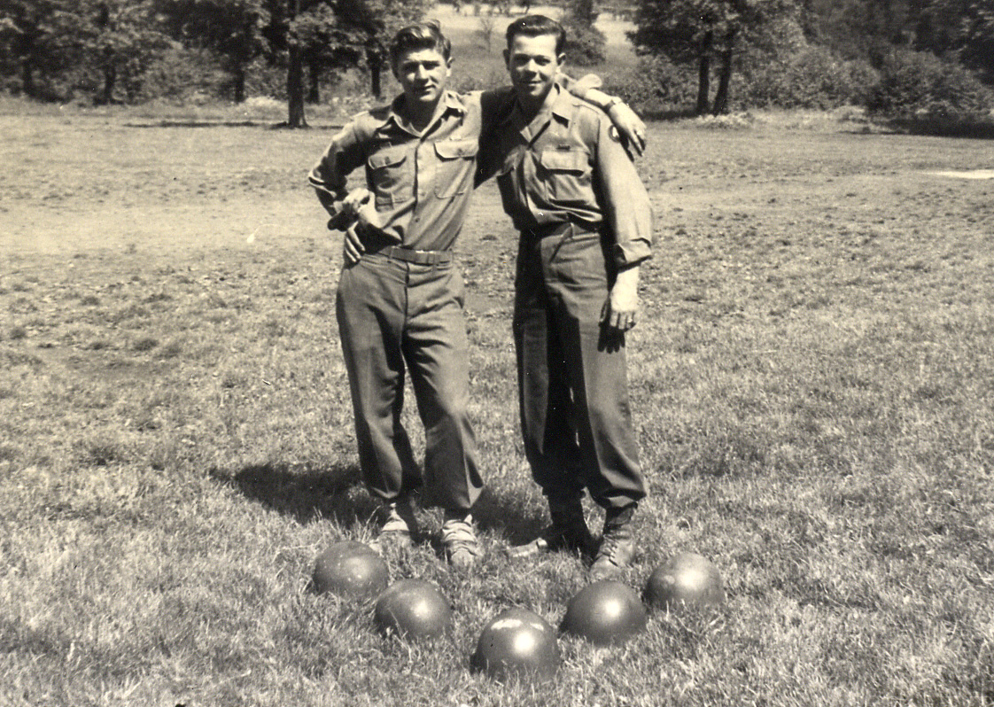 Ken Kassel in Stadstenach, Germany. -His shot up helmet in in the D-Day Museum in New Orleans. Photo provided by: Leon J. Kukulka |