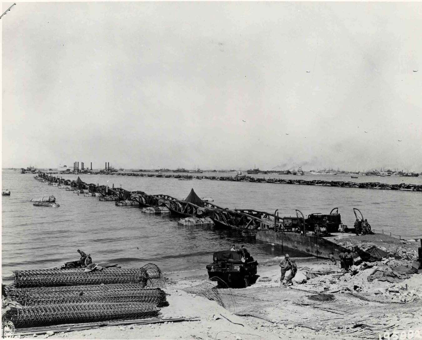 June 23rd 1944 - Omaha Beach 23 June 1944 and states that "These improvised landing platforms extending into Omaha Beach channel will be used to receive vast quantities of material from landing craft for transfer to the continent."