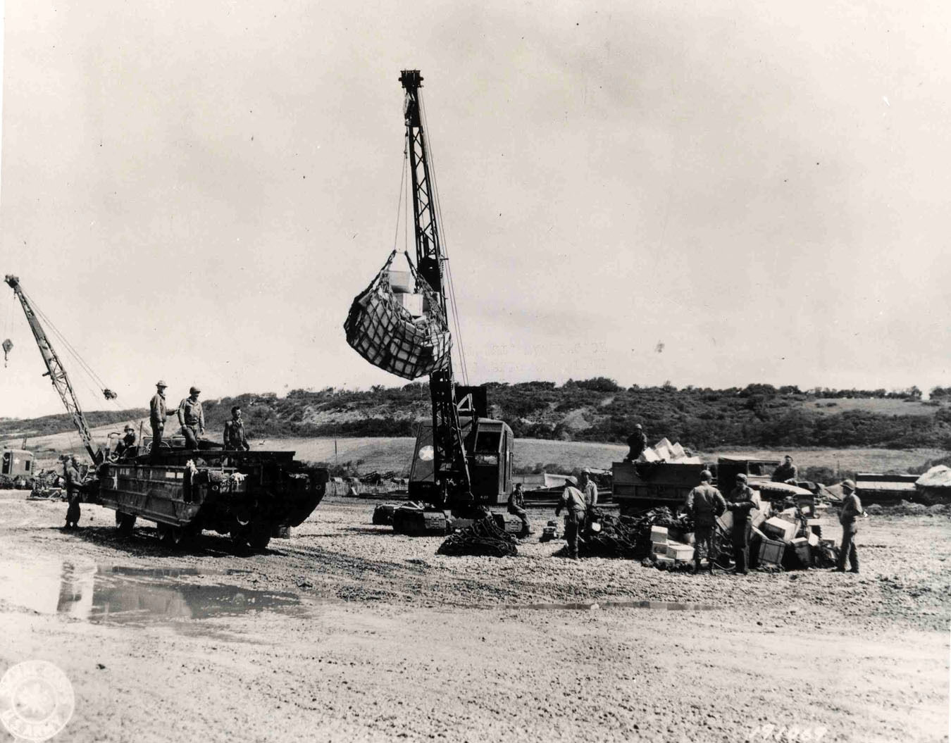 July 1st 1944 - Omaha Beach A crane lifting food in Omaha Beach, France. The food will be transferred to a truck and delivered to soldiers on the front line and also to French civilians through the Civil Affairs authorities. Photo: 299th Open Source