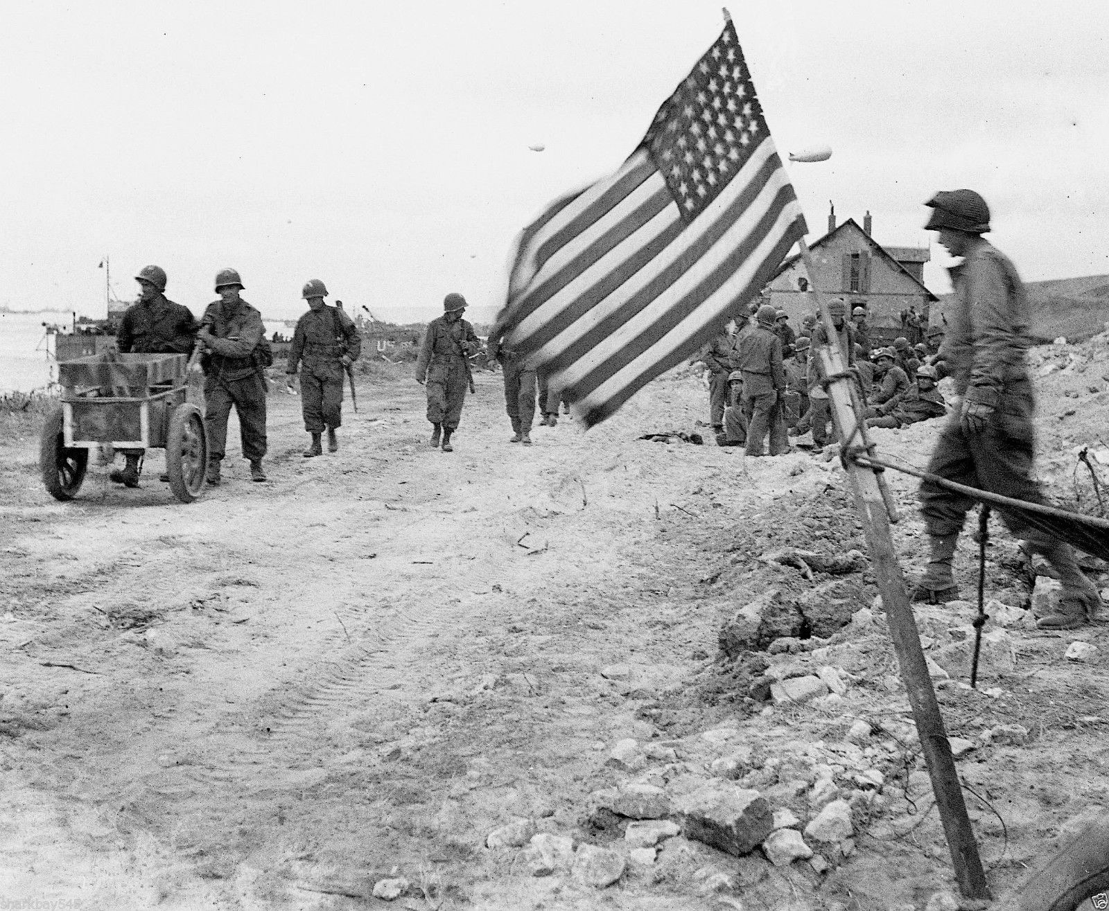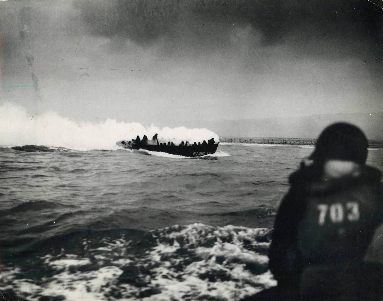 Taken D-Day - Omaha Beach 1944- LCVP PA 26-15 landing craft from USS Samuel Chase (APA-26) carrying troops of the 1st Battalion approaches Omaha Beach. The fire resulted when a German machine gun bullet hit a hand grenade. Photo: 299th Open Source |