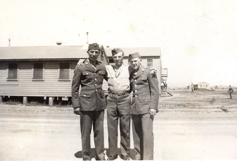 Striking a pose...Camp White, Oregon 1943. (Left to Right back row: Irving Schumm & John? Langham, seated is Andrew L. Miles) ? |