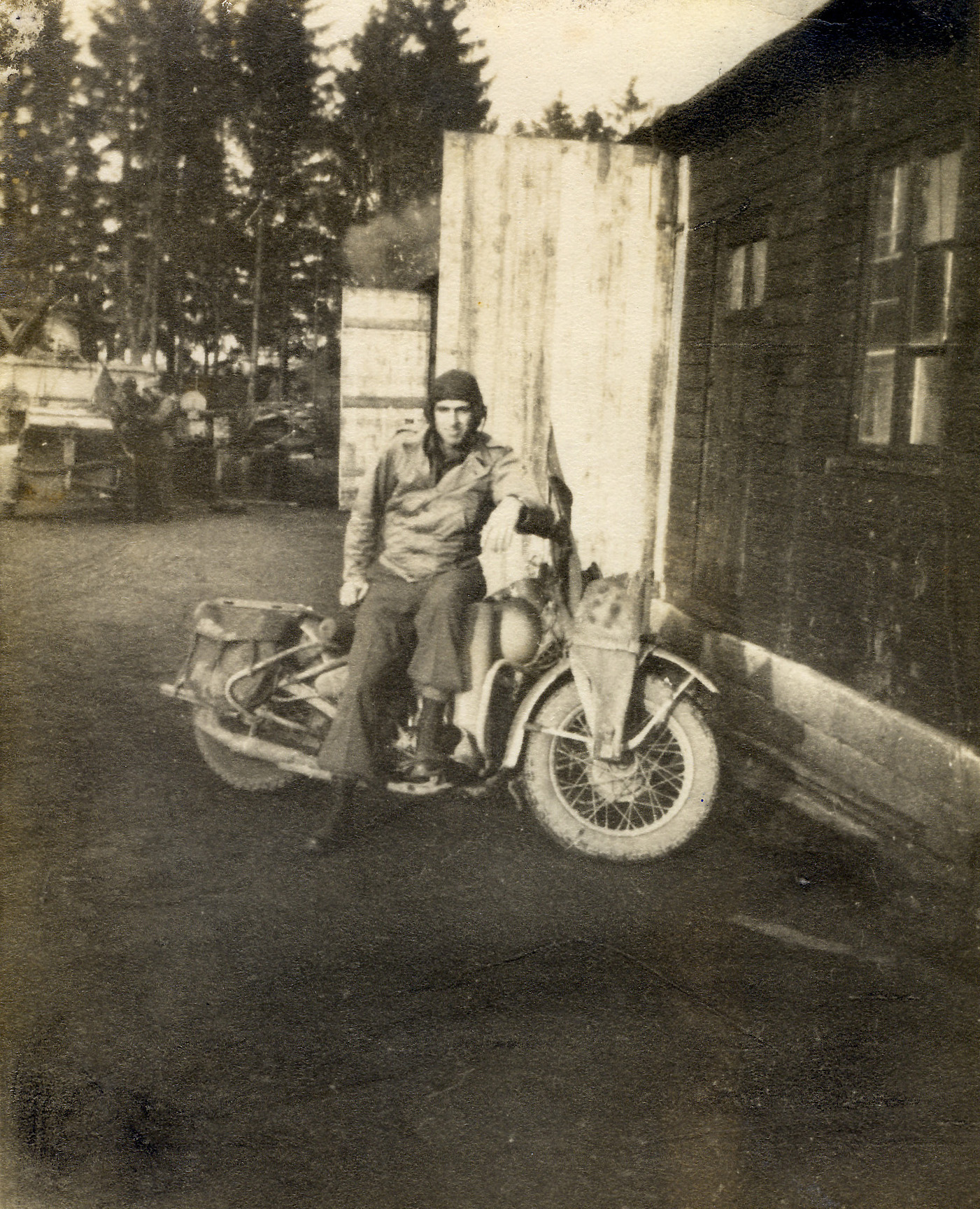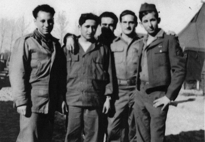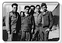 299th getting ready to go home - Camp Lucky Strike Le Harve, France (left to right) T-4 Joe Colacino, T-5 Mike Accordino, PVT Donald Klumbach, S-SGT Jim Mancuso("A" Company Cook), CPL Al Littke. Photo provided by: Mike Accordino - PVT "A" Company |
