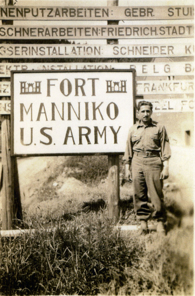 Stadtsenach, Germany - Fort Manniko, named for Capt. Bob Manniko ("A" Company CO) (Standing next to sign) T-5 Mike Accordino. Photo provided by: Mike Accordino - PVT "A" Company |