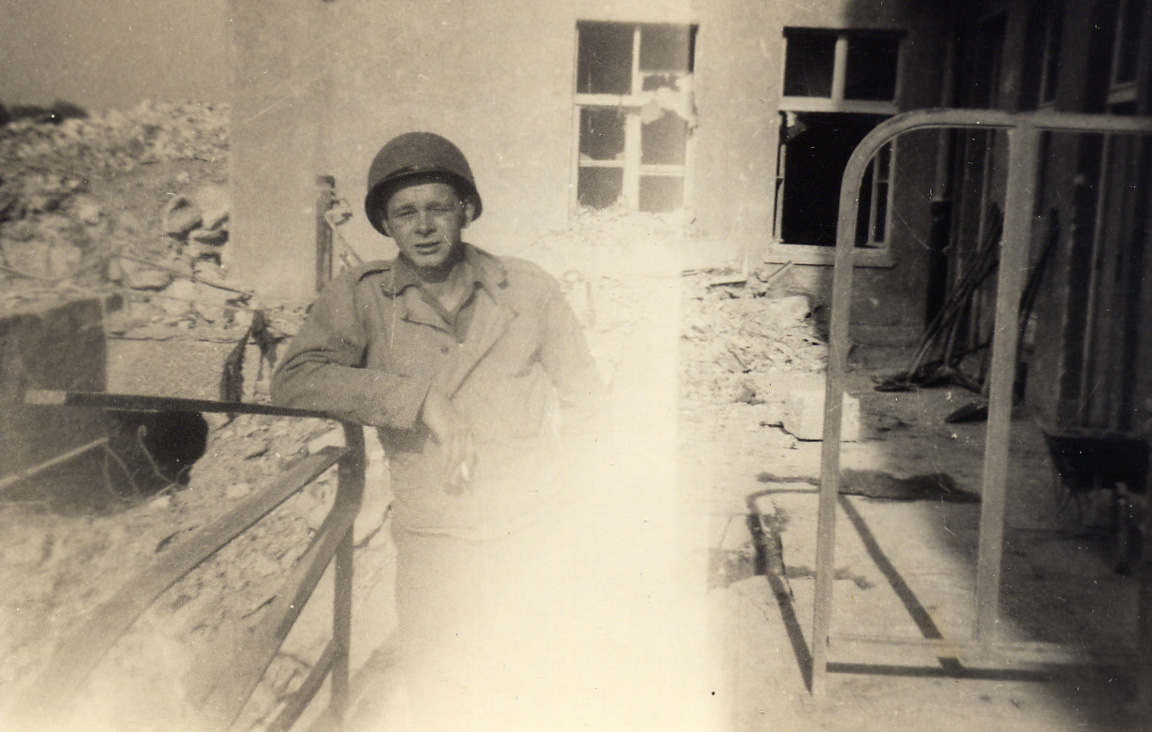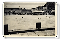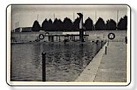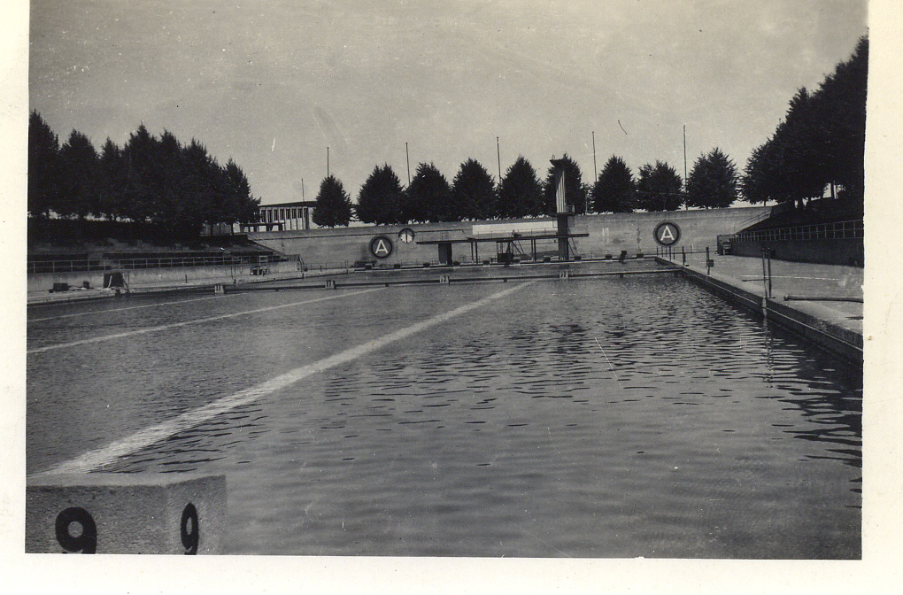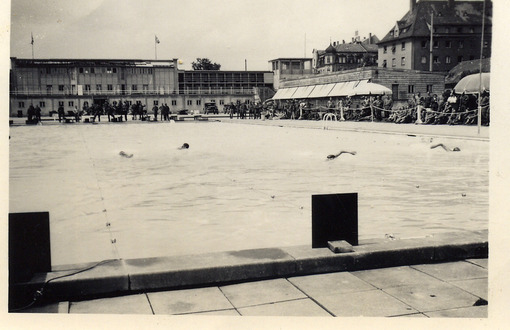 Army using the Swimming Pool at Neuremberg. This pool was used for the 1936 Olympics. Note the Olympic Logoon the building at the left. Photo provided by: Leon J. Kukulka |